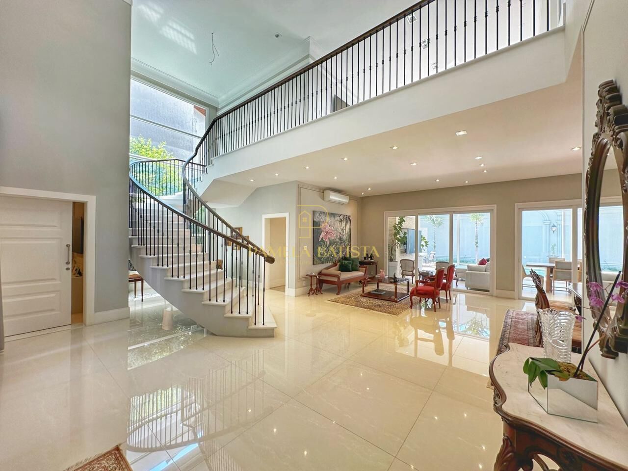 O pavimento inferior temos a suíte principal, living em 3 ambientes, cozinha, Home Theater, área gourmet, área de serviço, piscina, suíte de visitas e 2 lavabos.