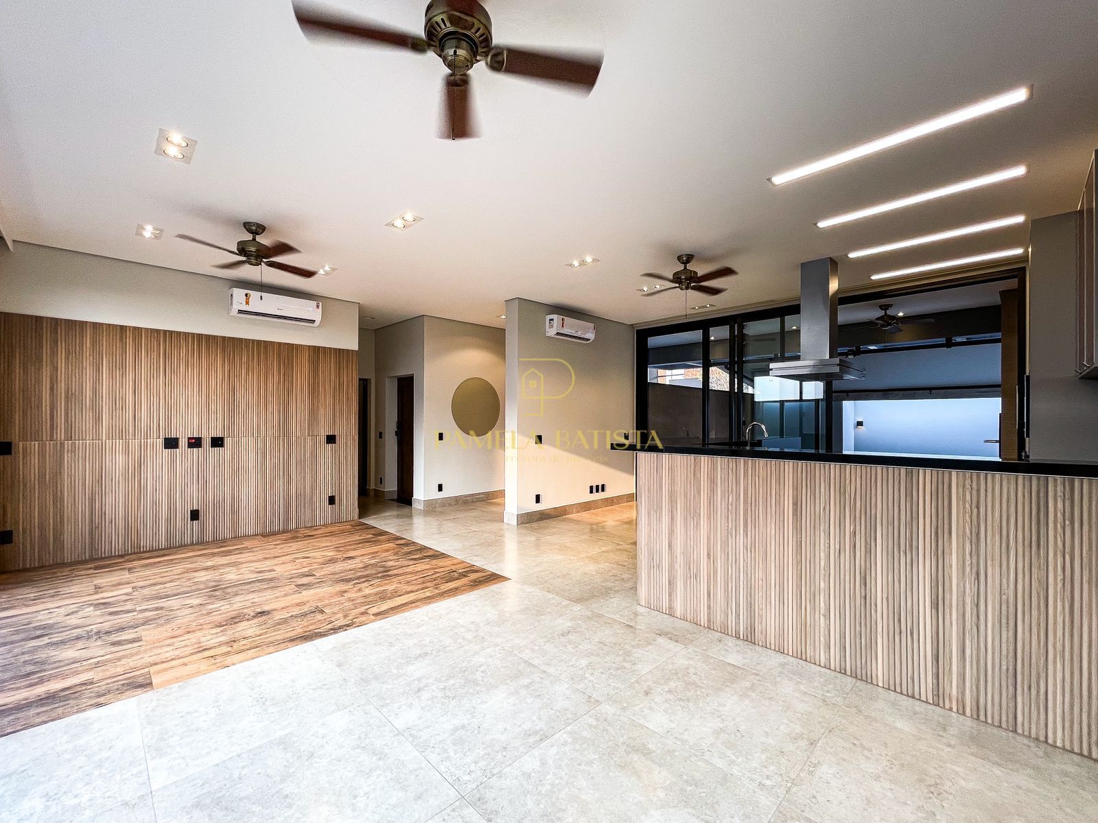 ✔️ Sala de TV, jantar e cozinha integradas com ilha em granito e eletrodomésticos instalados